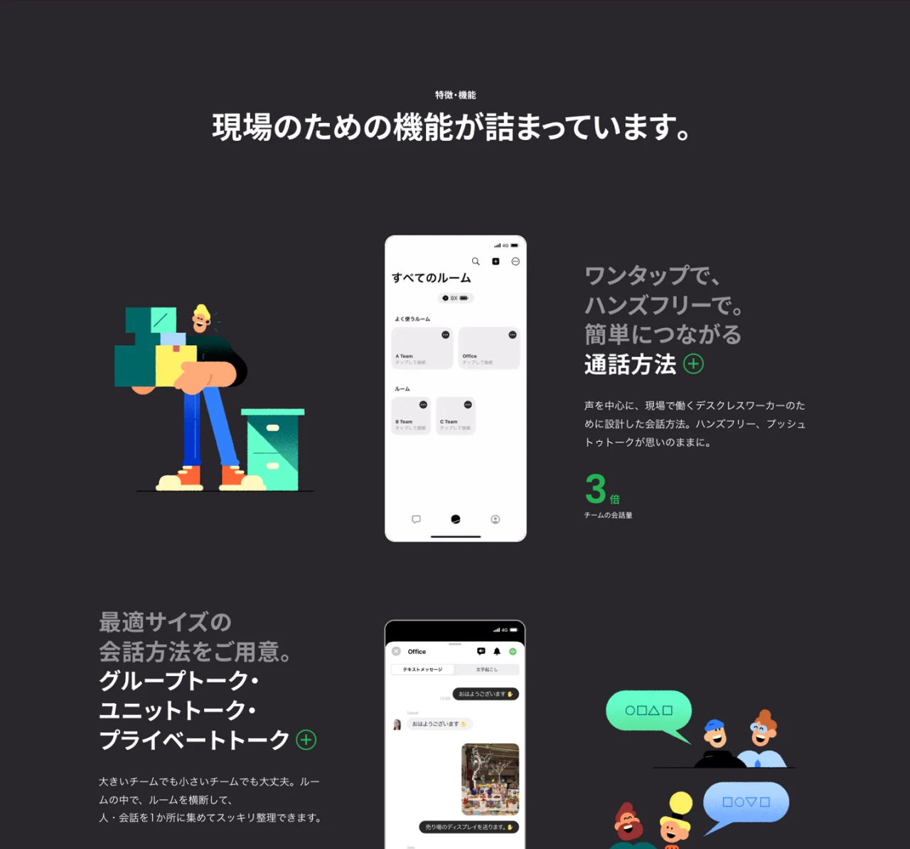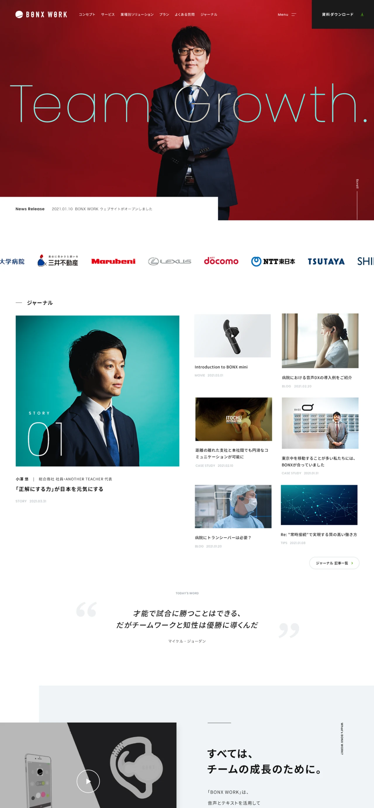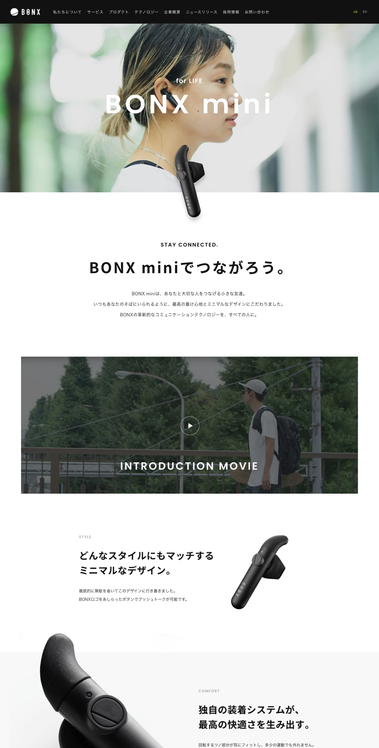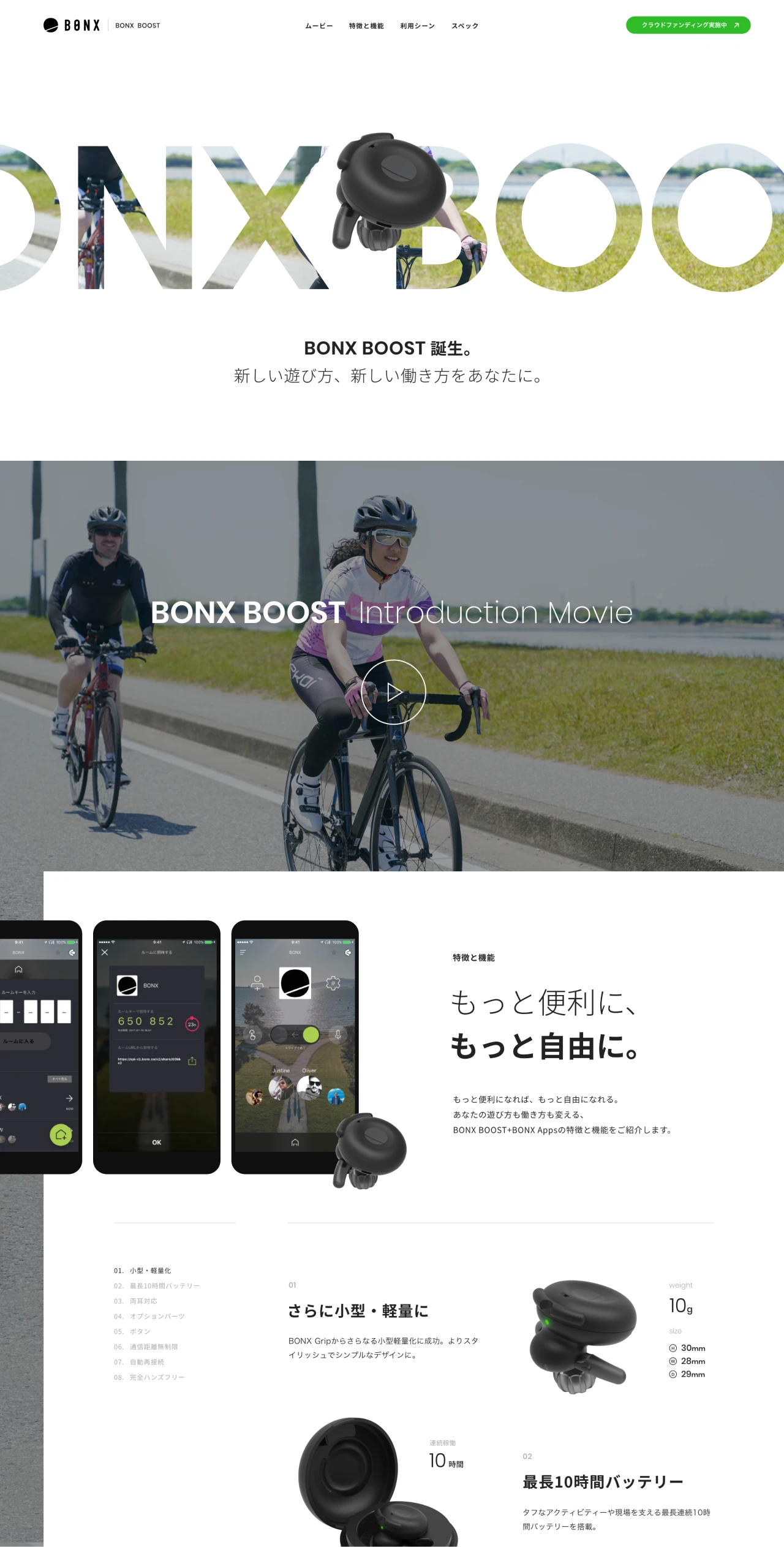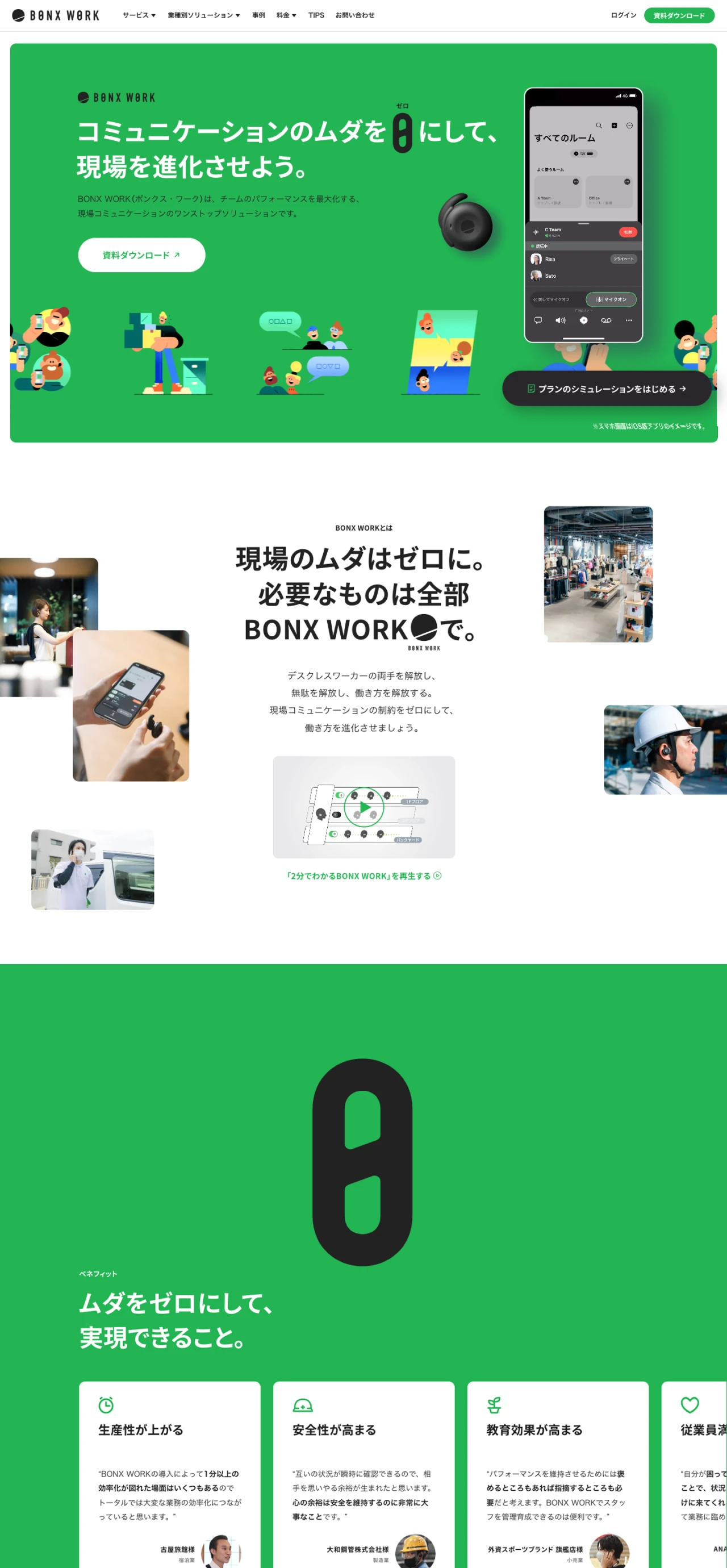 スマートフォンのインターネット回線を使ったグループ通話コミュニケーションツール「BONX」のデジタル周りデザインをフォームアンドクラフトが担当。これまでブランドサイトや製品LP,法人向けサイトを制作したほか,プロモーション用にモデルを起用した写真撮影も行っている。チームメンバーは流動的で,私はウェブデザイナーの一人として関わっている。