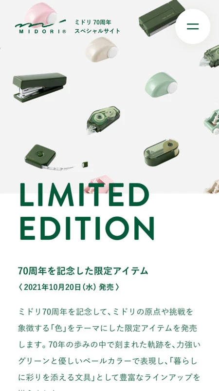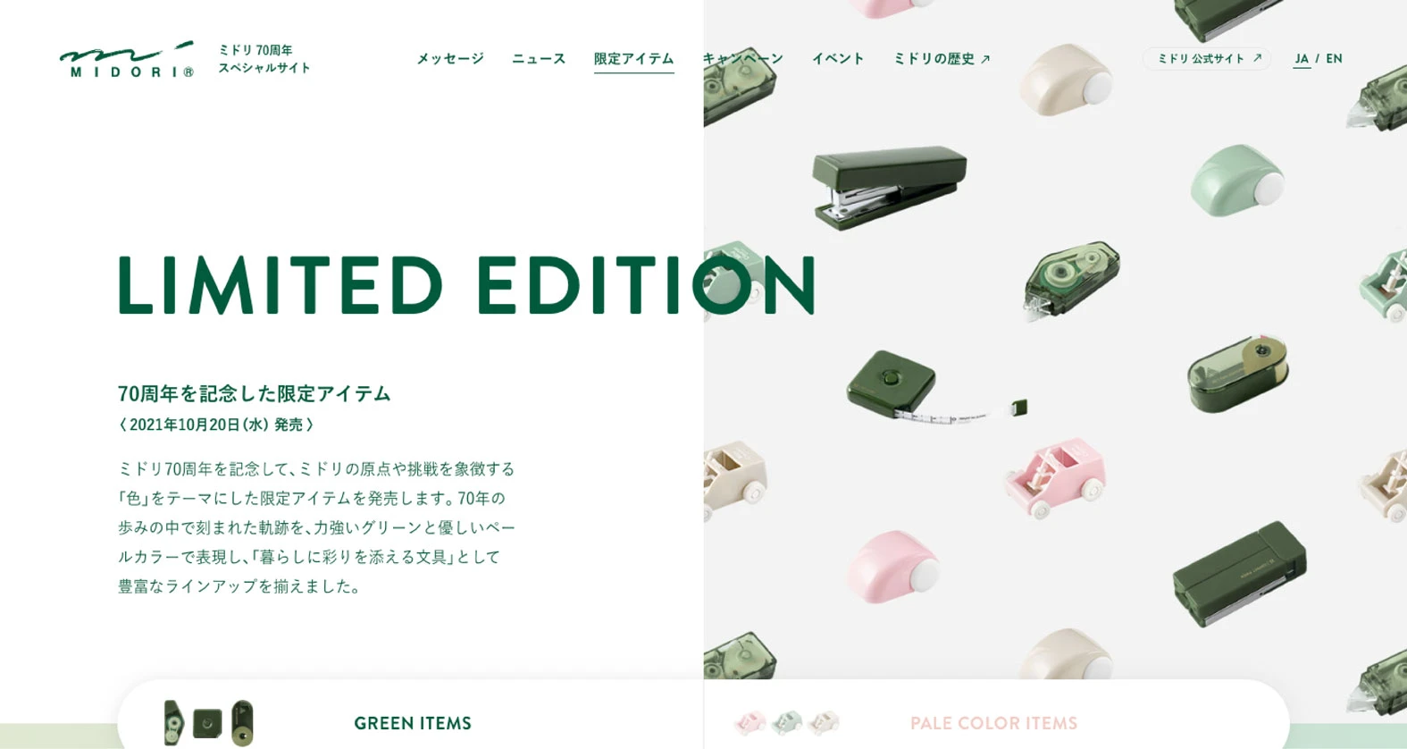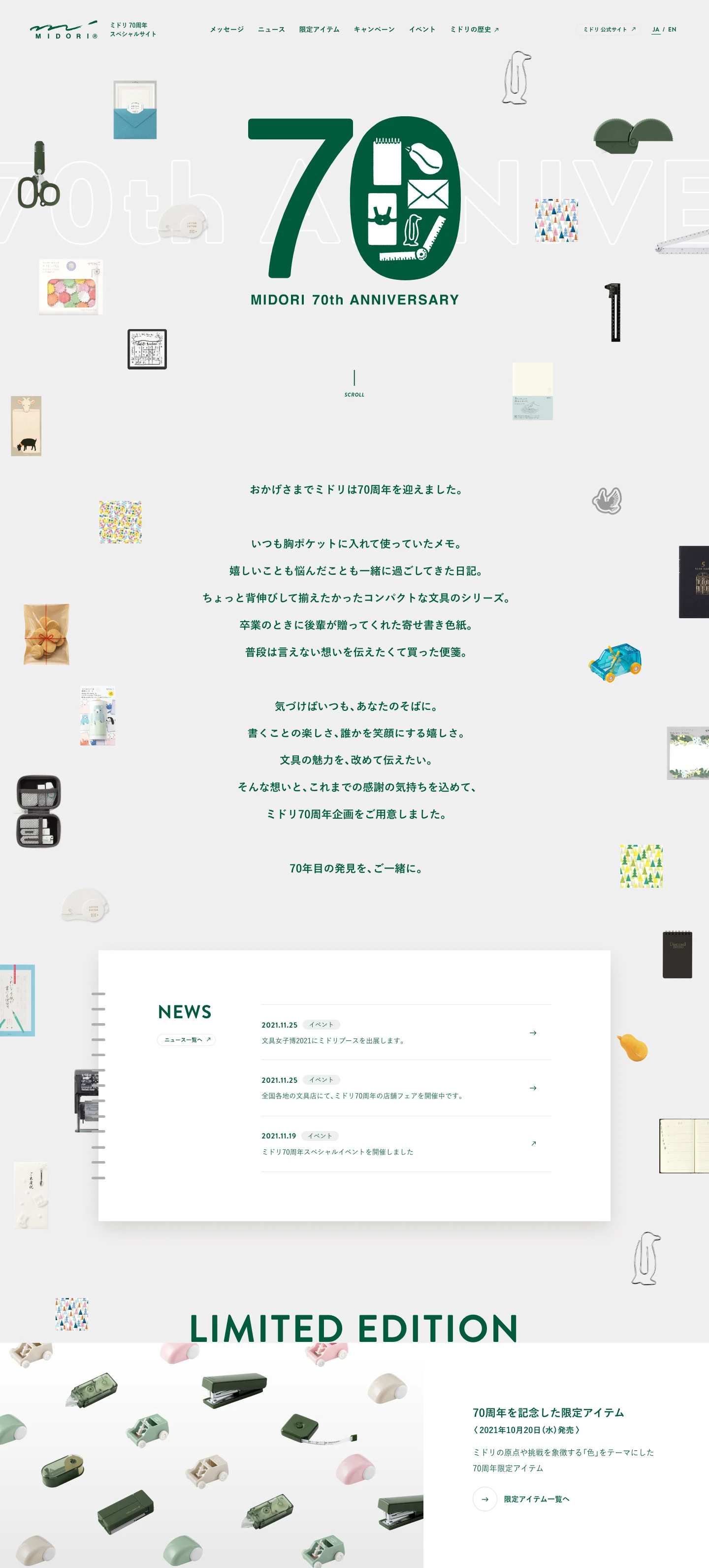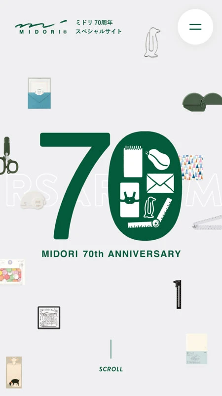 文具ブランド「ミドリ」の70周年を記念したスペシャルサイト。
