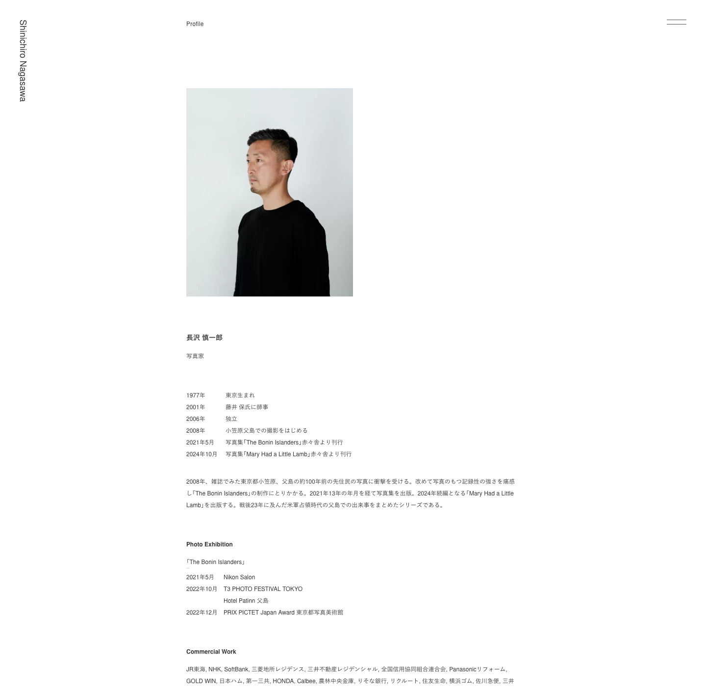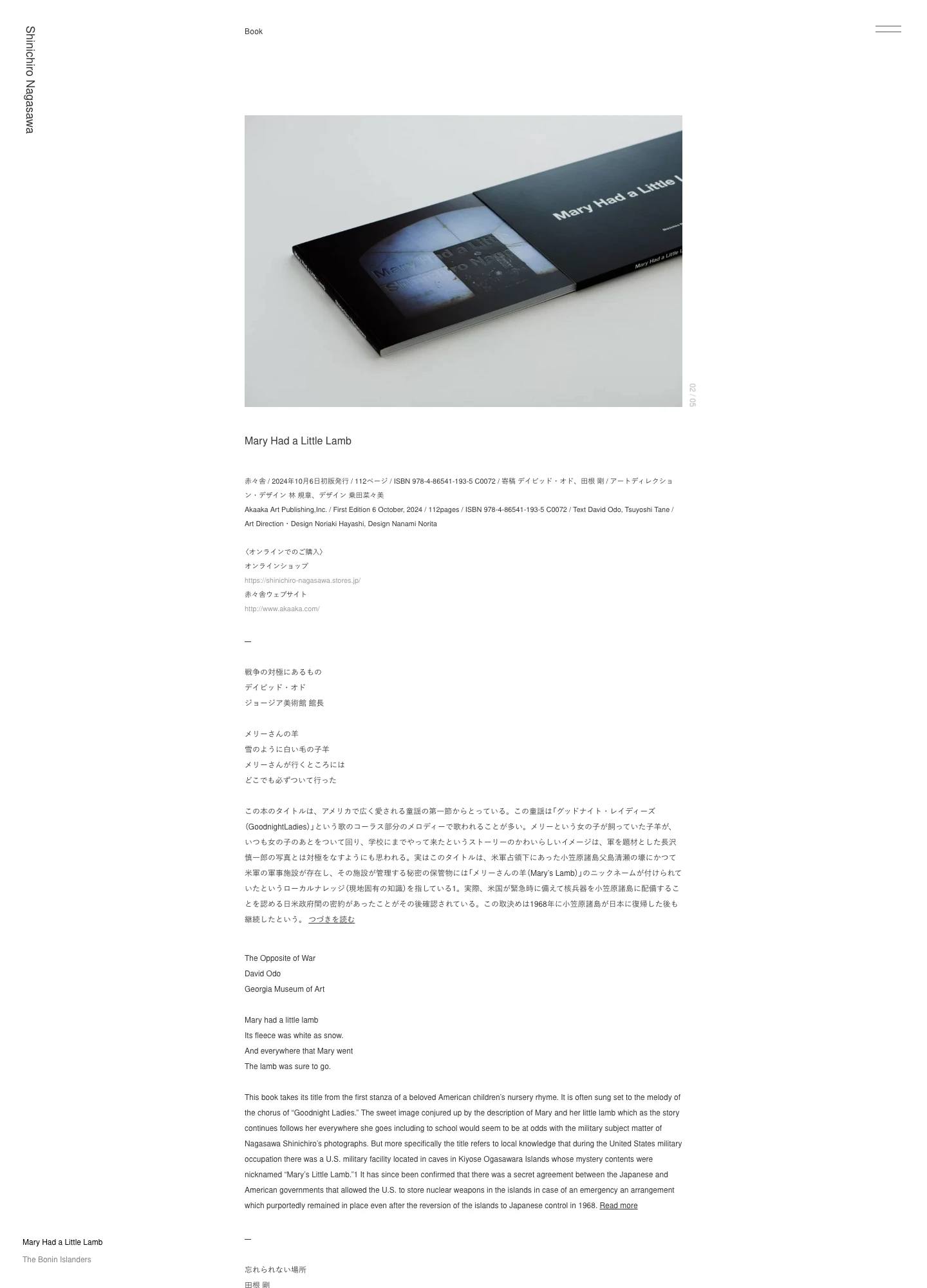 ローンチ時には長沢さんのライフワークである小笠原に住むアメリカ系移民たちとその歴史を写した「The Bonin Islanders」と,代表的な仕事であるJR東海「うましうるわし奈良」の2シリーズのみ掲載。2024年には新作「Mary Had a Little Lamb」を発表したタイミングでウェブサイトもアップデート。より写真に対するアティテュードが際立つサイトとなった。