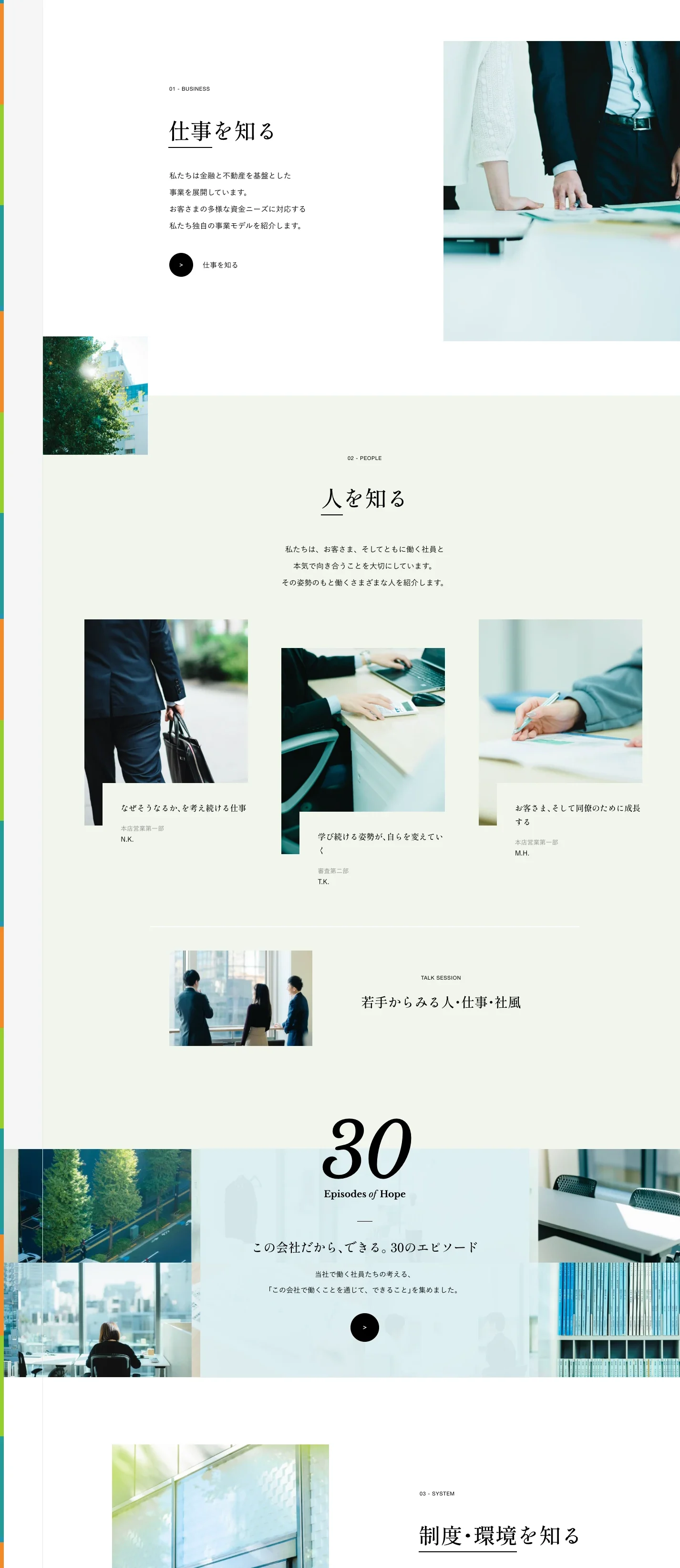 本社オフィスの映像で品性を,各アセットクラスを代表する物件の映像で事業の規模感を,タイポグラフィやレイアウトの質感で信頼感と安定感を表現している。