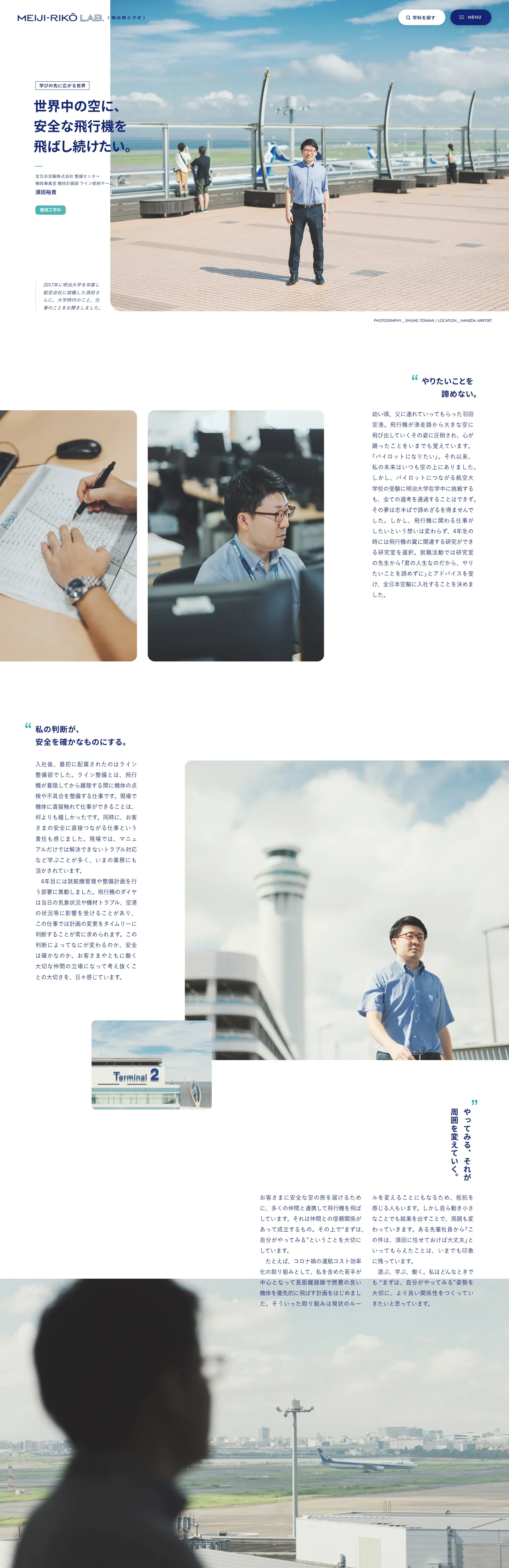 本プロジェクトは初年度に在校生,2年目に先生,3年目には卒業生へのインタビューを実施。それらを記事化することで,より多角的,より立体的に明治理工を知ることのできるウェブサイトへ成長した。