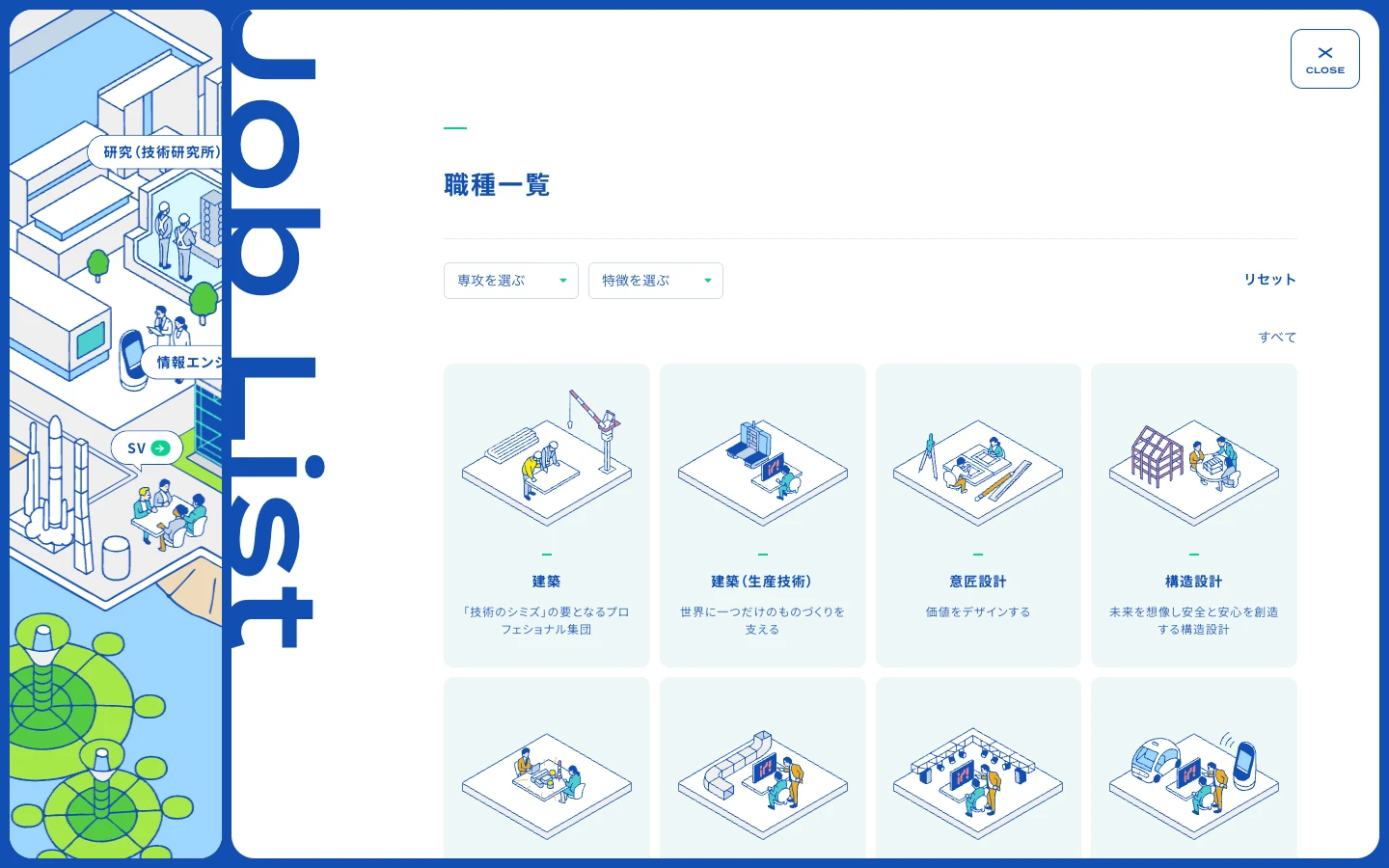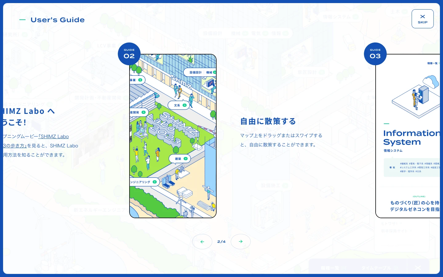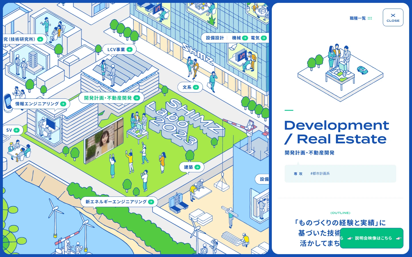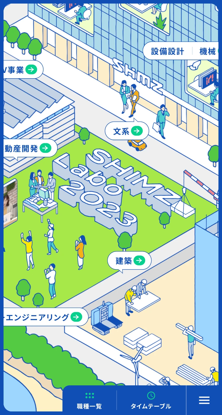 清水建設に興味を持つ学生に向けて各職種が同時多発的にオンラインの説明会を行う,清水建設主催のオンライン職業理解イベント「SHIMZ Labo 2023」の特設サイト。