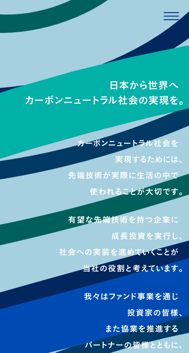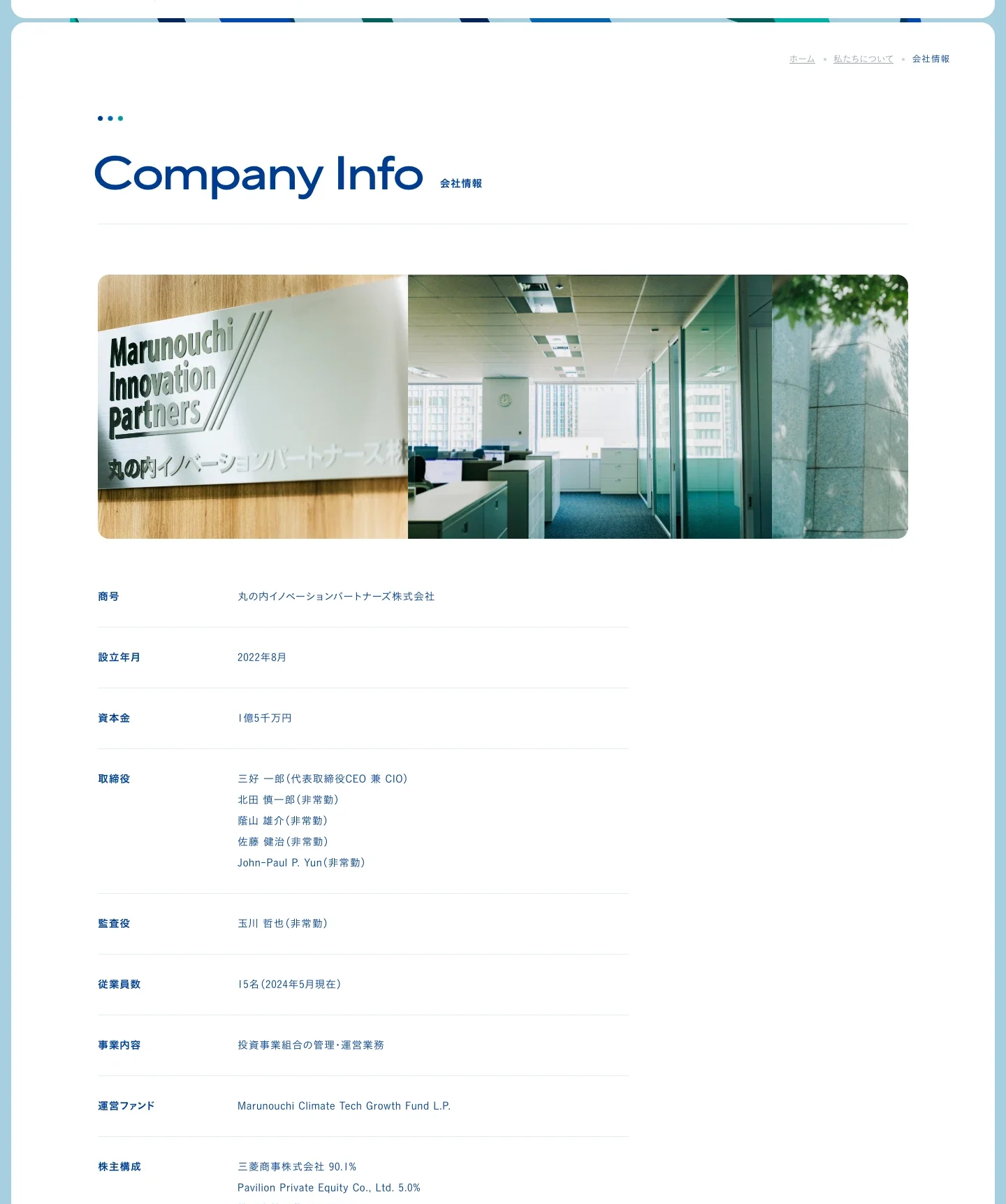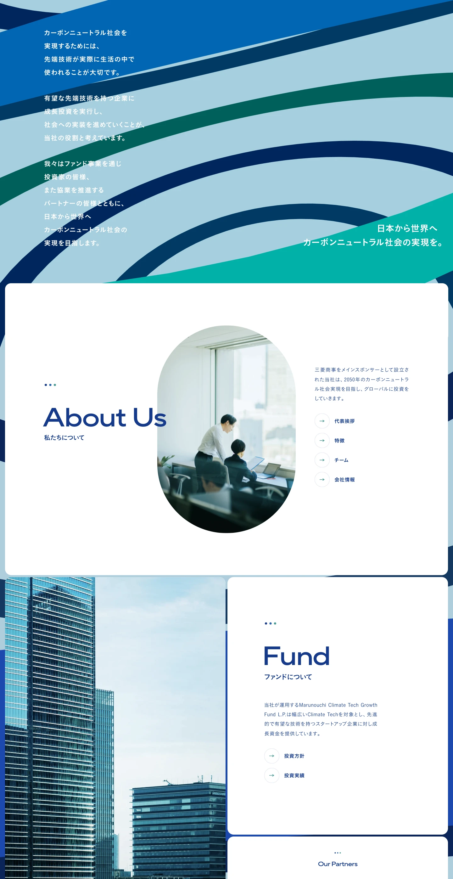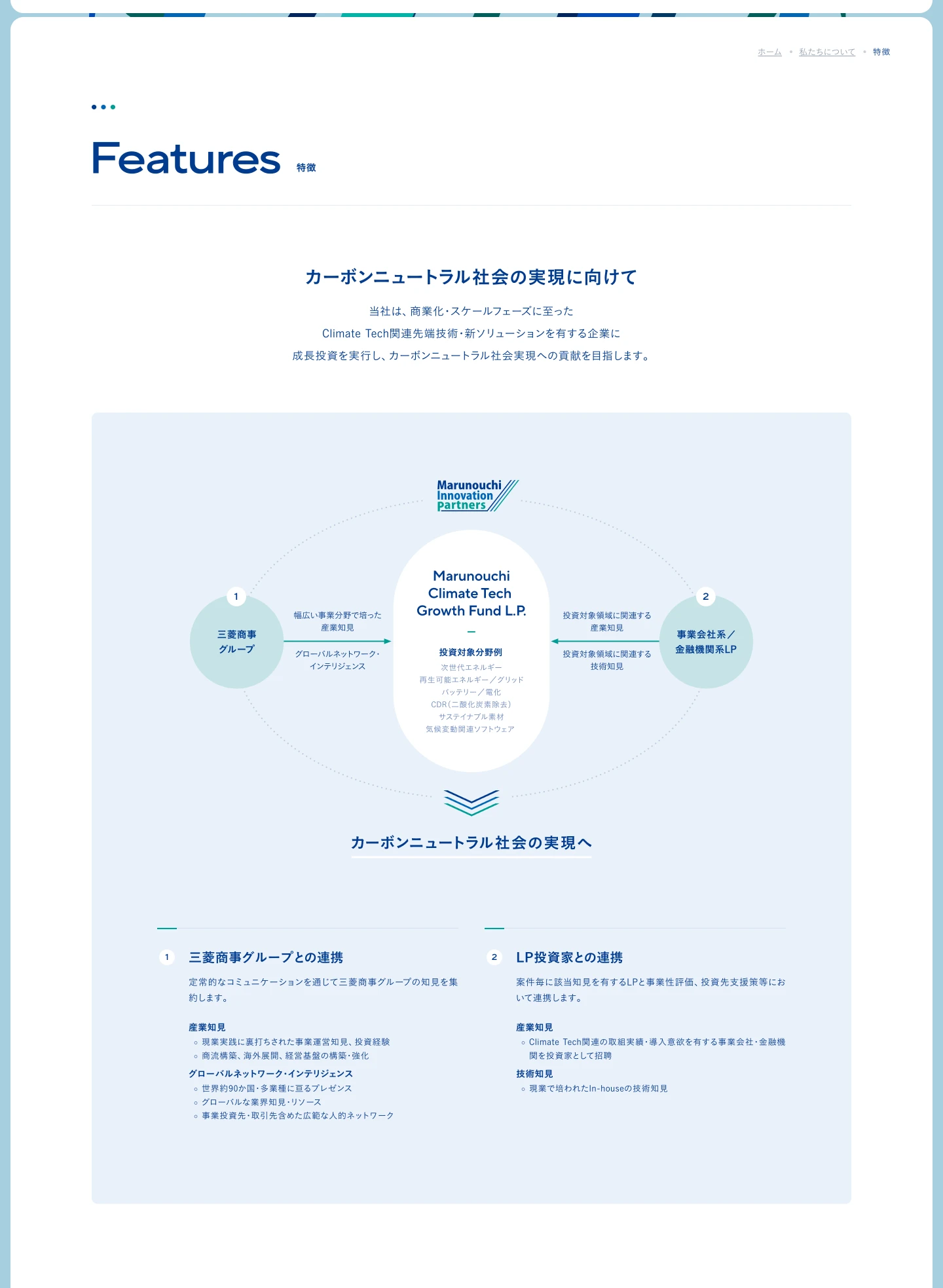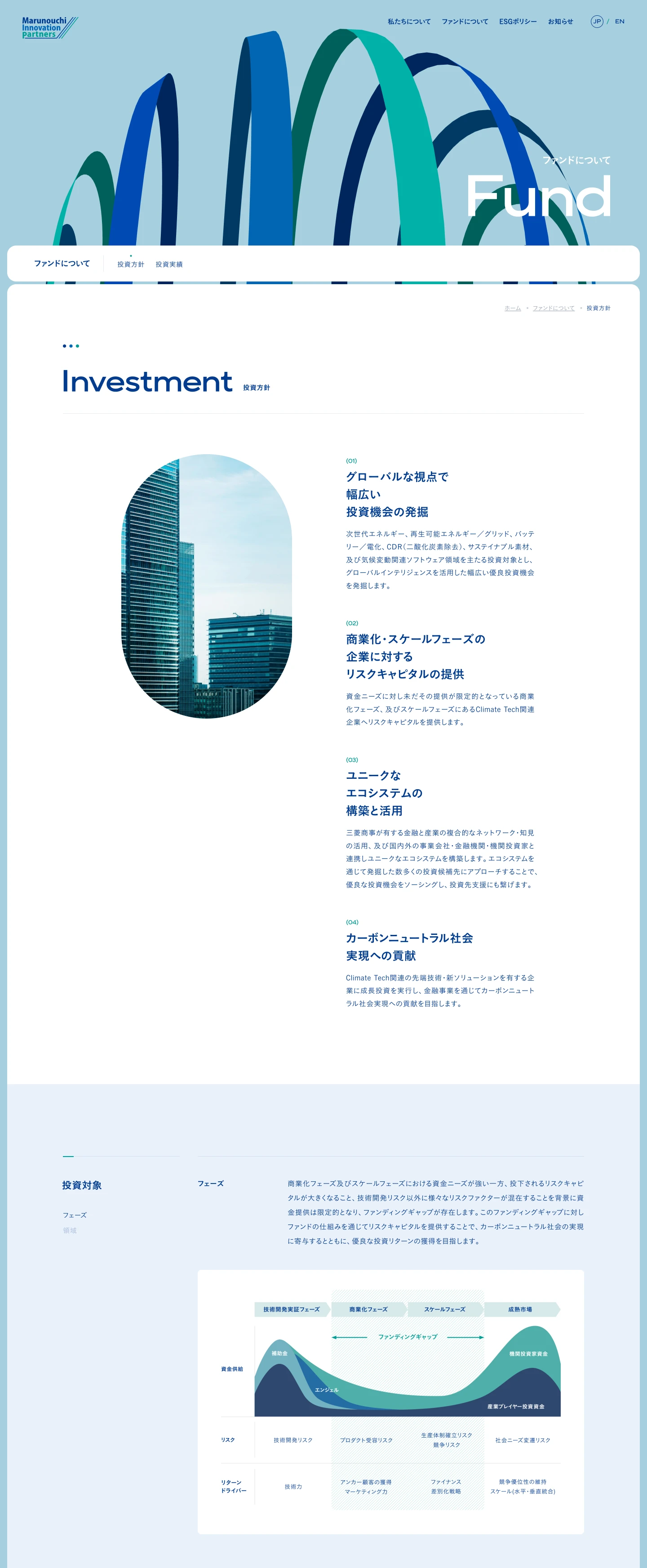 Climate Tech(気候テック)分野への投資を行う丸の内イノベーションパートナーズのコーポレートサイトの新規作成。当時同社は立ち上がったばかりで,出せる実績や情報があまりない状況。その中でいかに同社の存在意義を伝えていくかが課題だった。