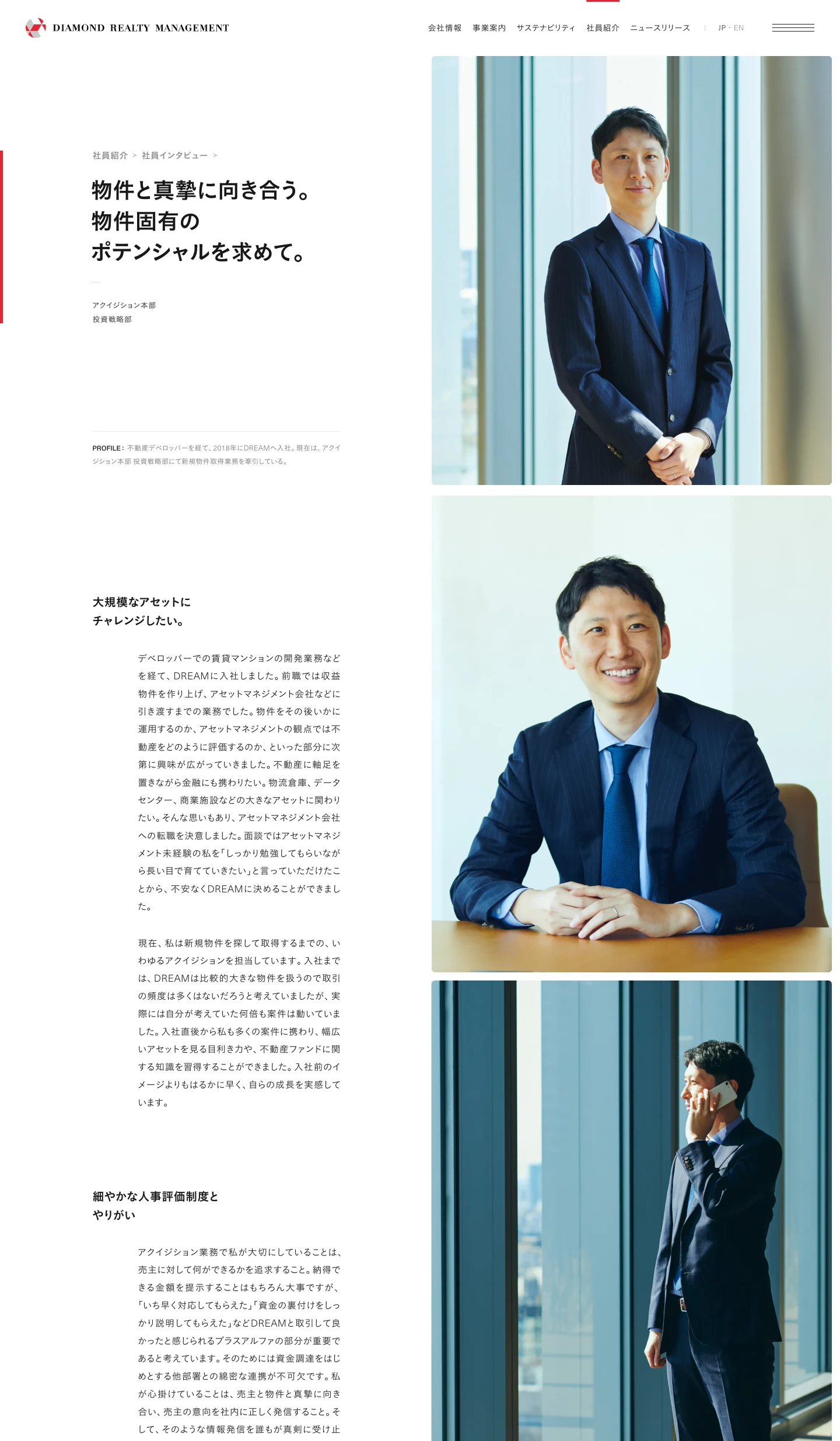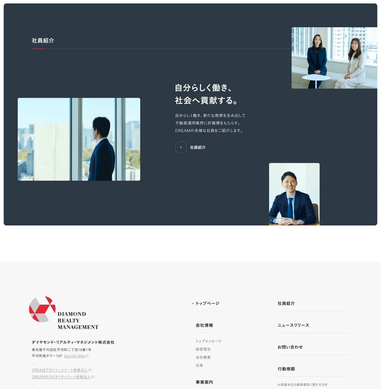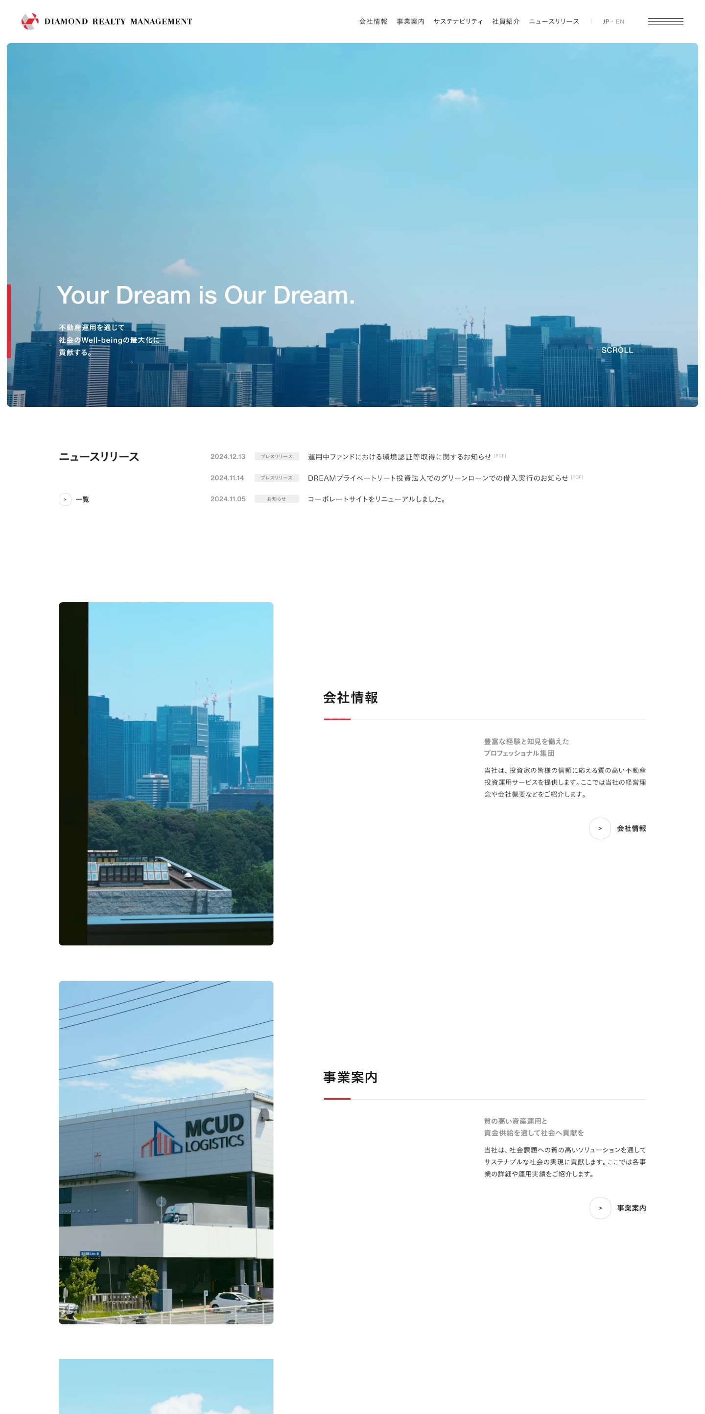 日本及び米国で不動産私募ファンド事業を行う,ダイヤモンド・リアルティ・マネジメントのコーポレートサイトのリニューアルプロジェクト。組織全体に通底する品性や安定性,新たな領域を開拓していく姿勢という同社の実態を可視化することを目指した。