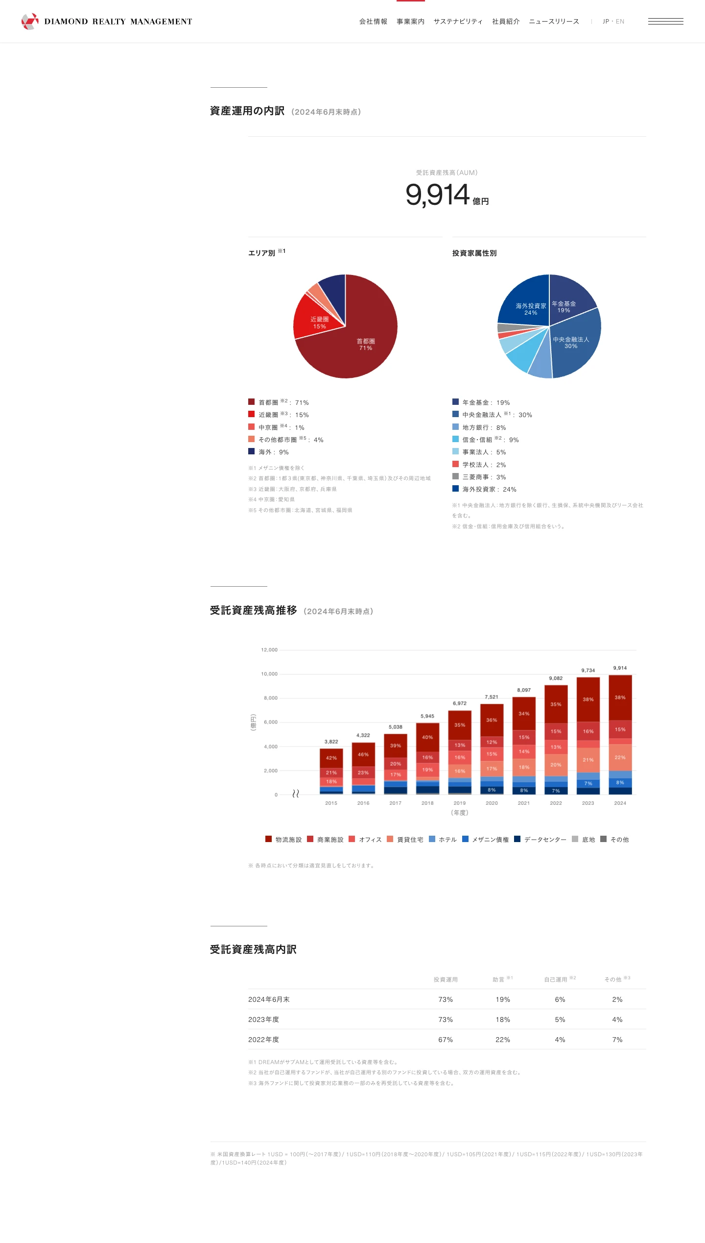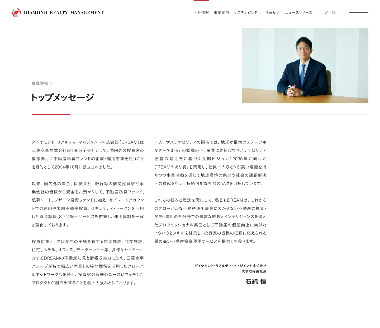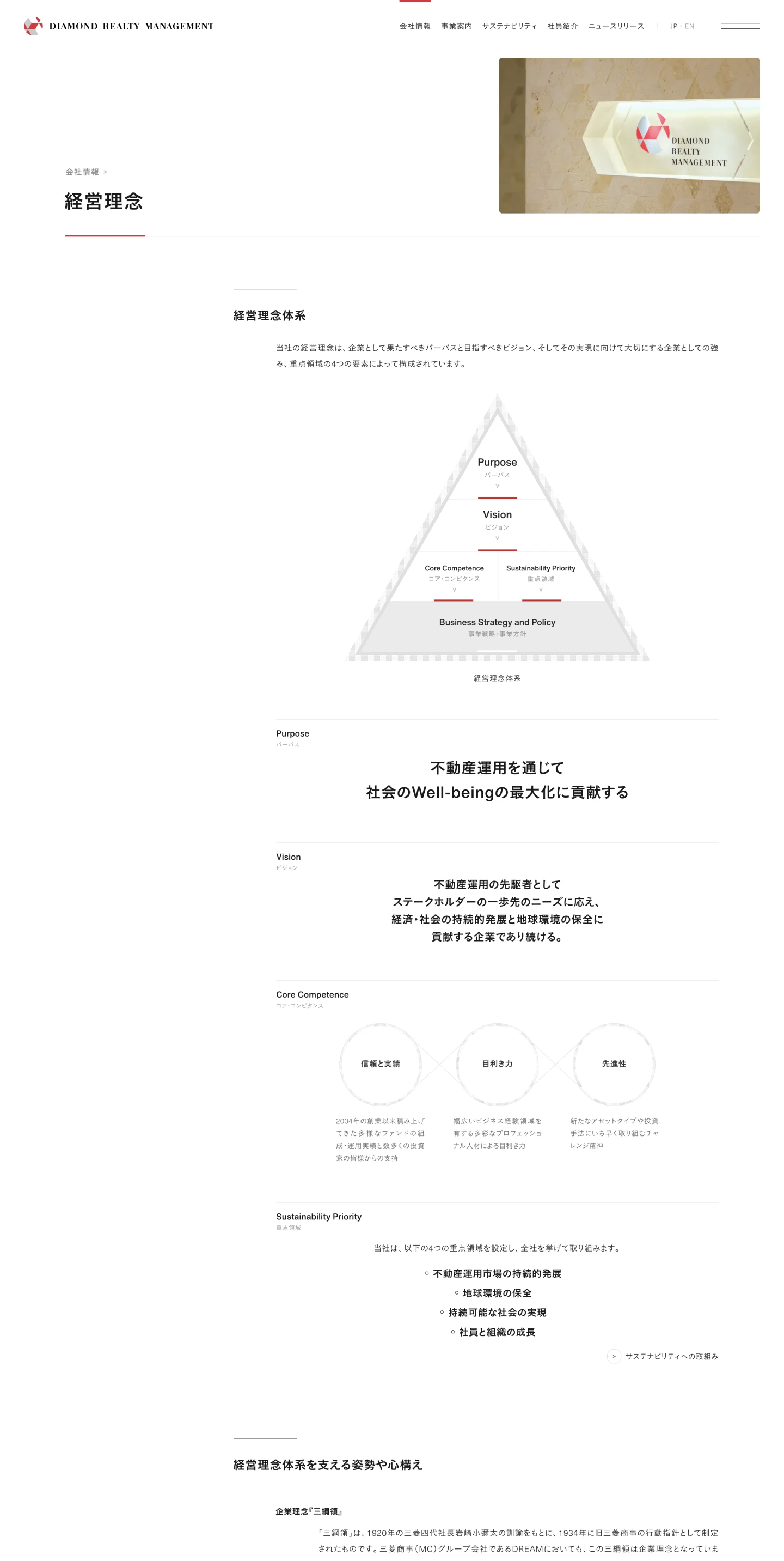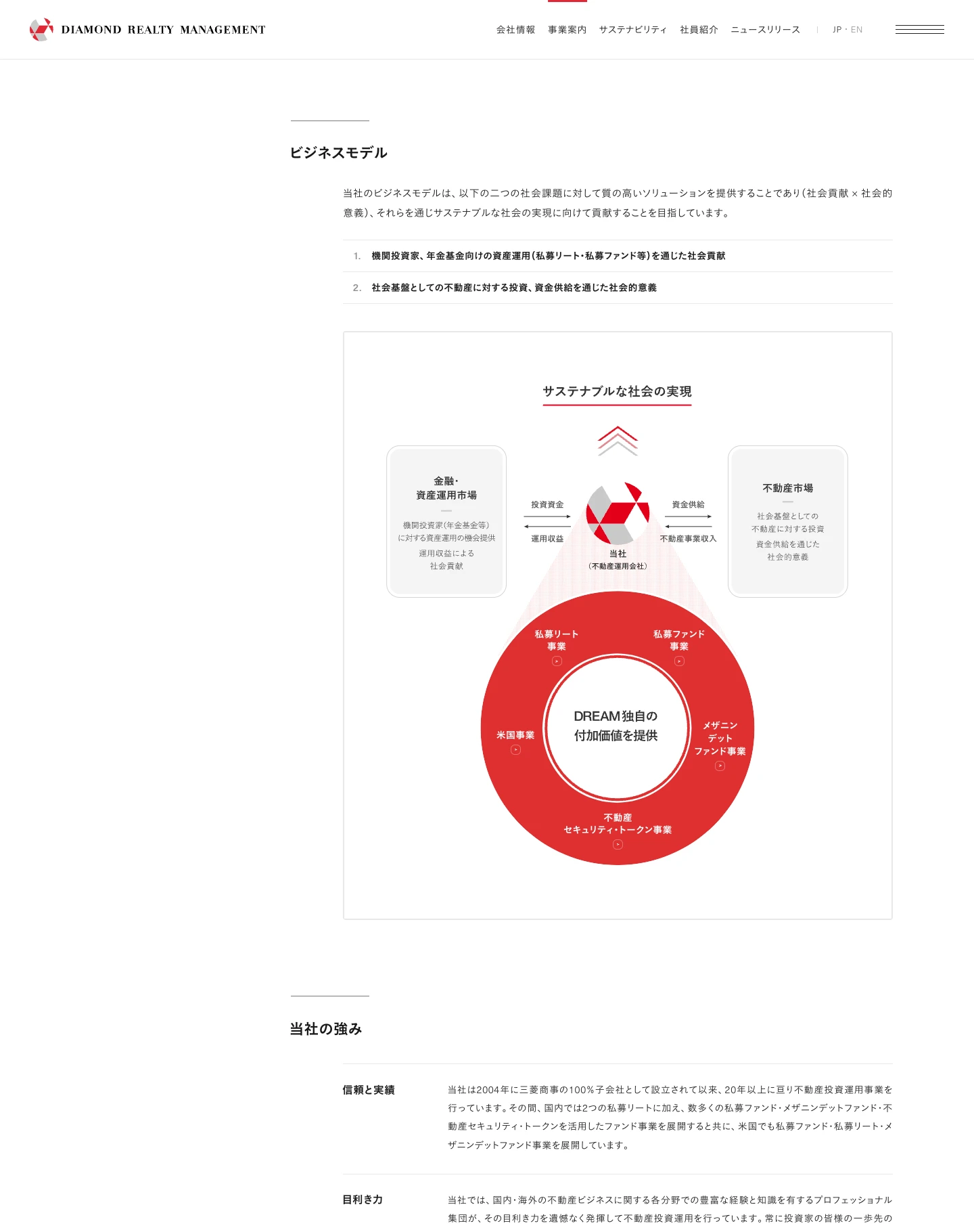 日本及び米国で不動産私募ファンド事業を行う,ダイヤモンド・リアルティ・マネジメントのコーポレートサイトのリニューアルプロジェクト。組織全体に通底する品性や安定性,新たな領域を開拓していく姿勢という同社の実態を可視化することを目指した。