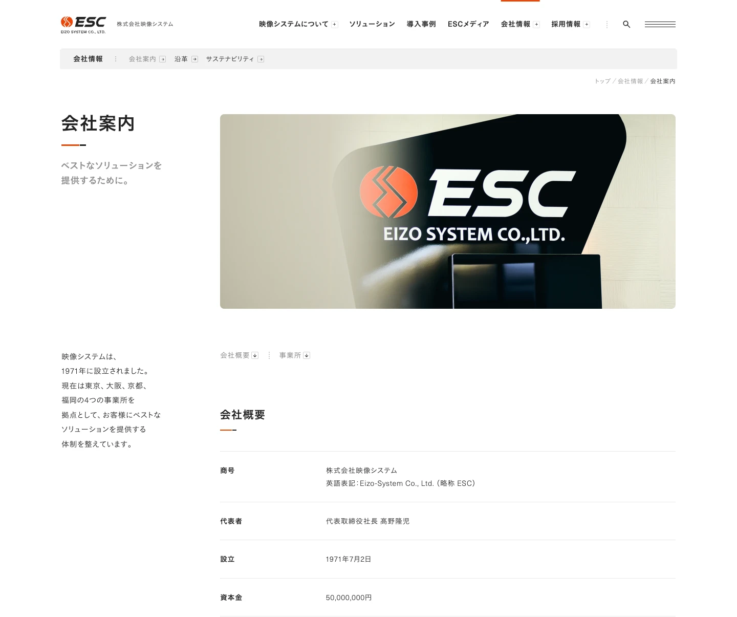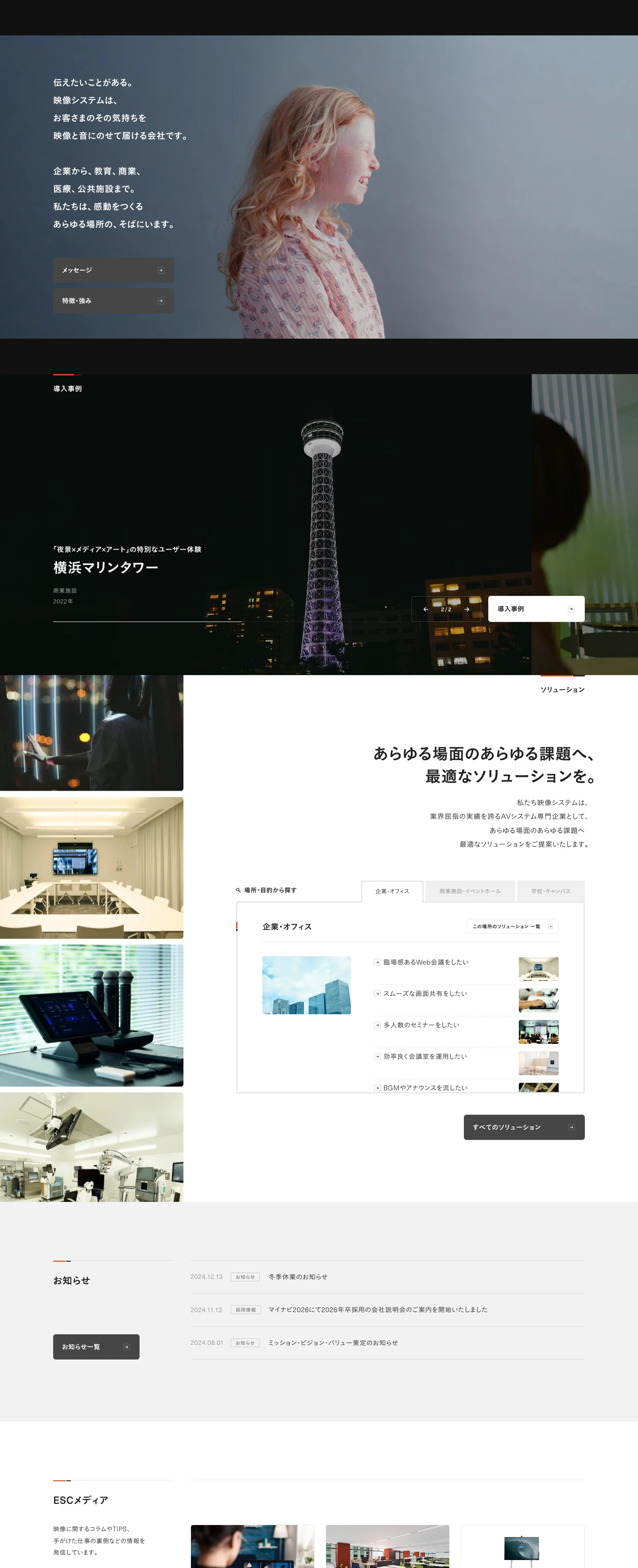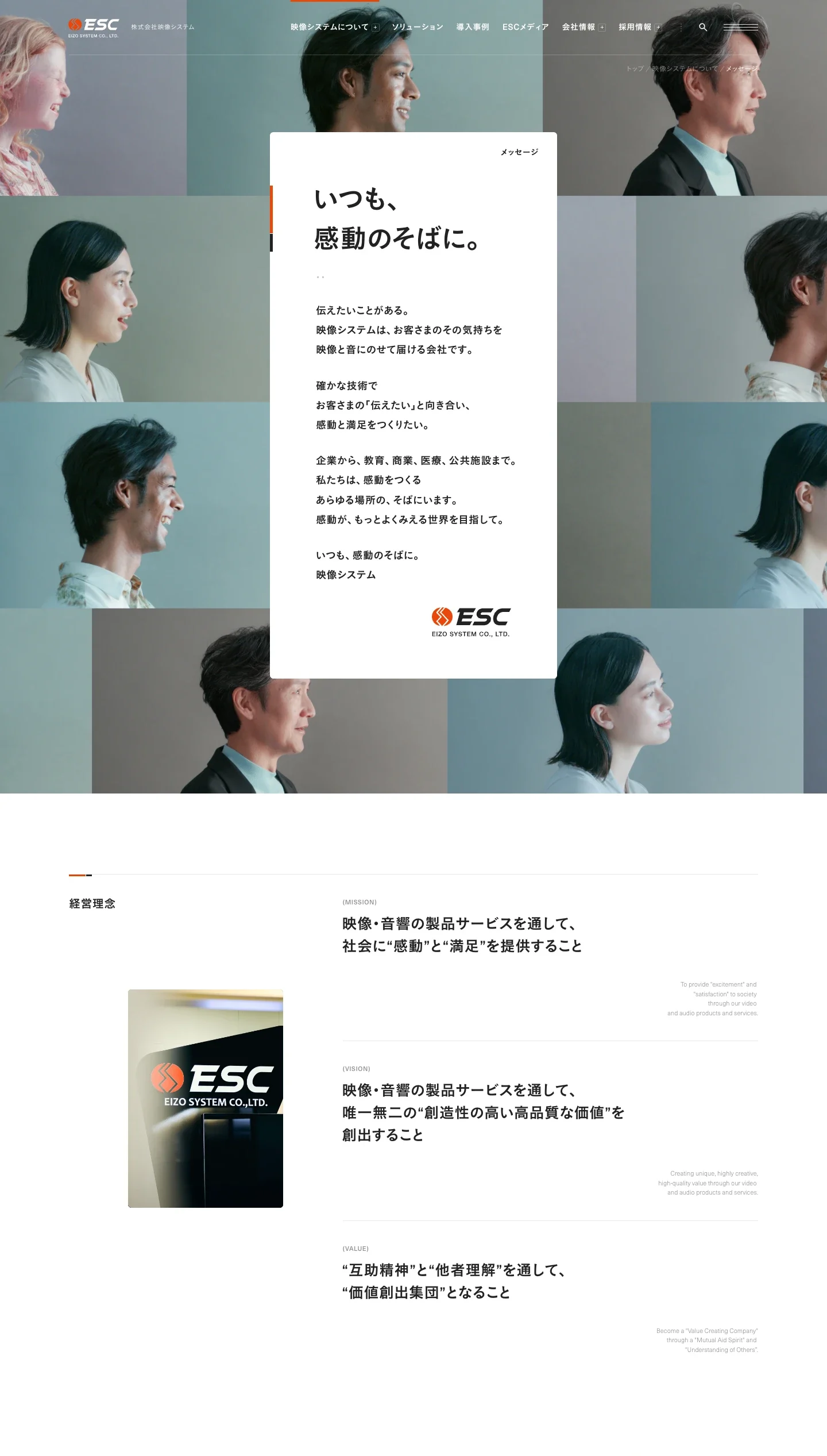 映像・音響のトータルソリューションを提供する映像システムのコーポレートサイトリニューアル。創業53年を迎えるタイミングで新たに制定されたミッション・ビジョン・バリュー(MVV)をウェブ上で表現していくことが主な目的だった。