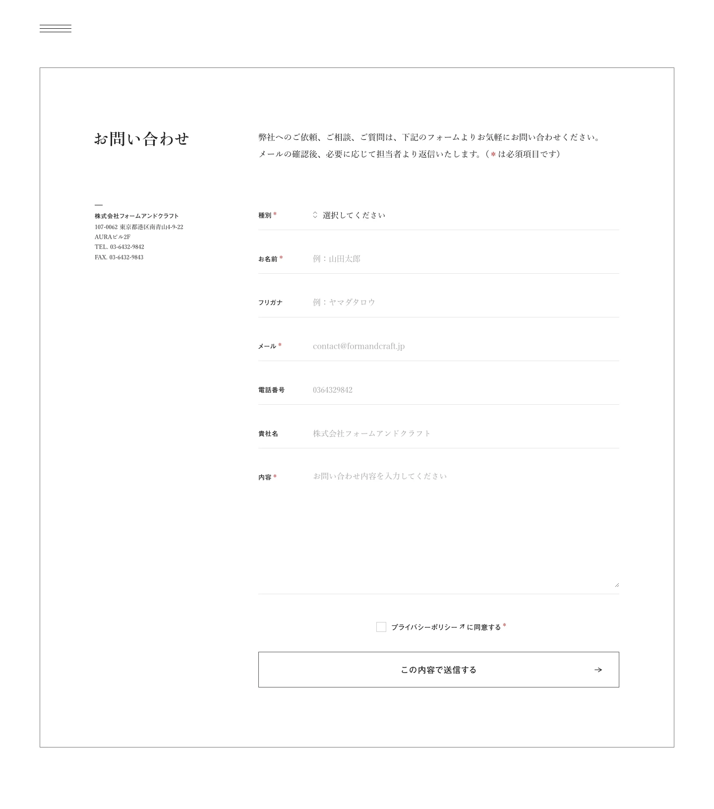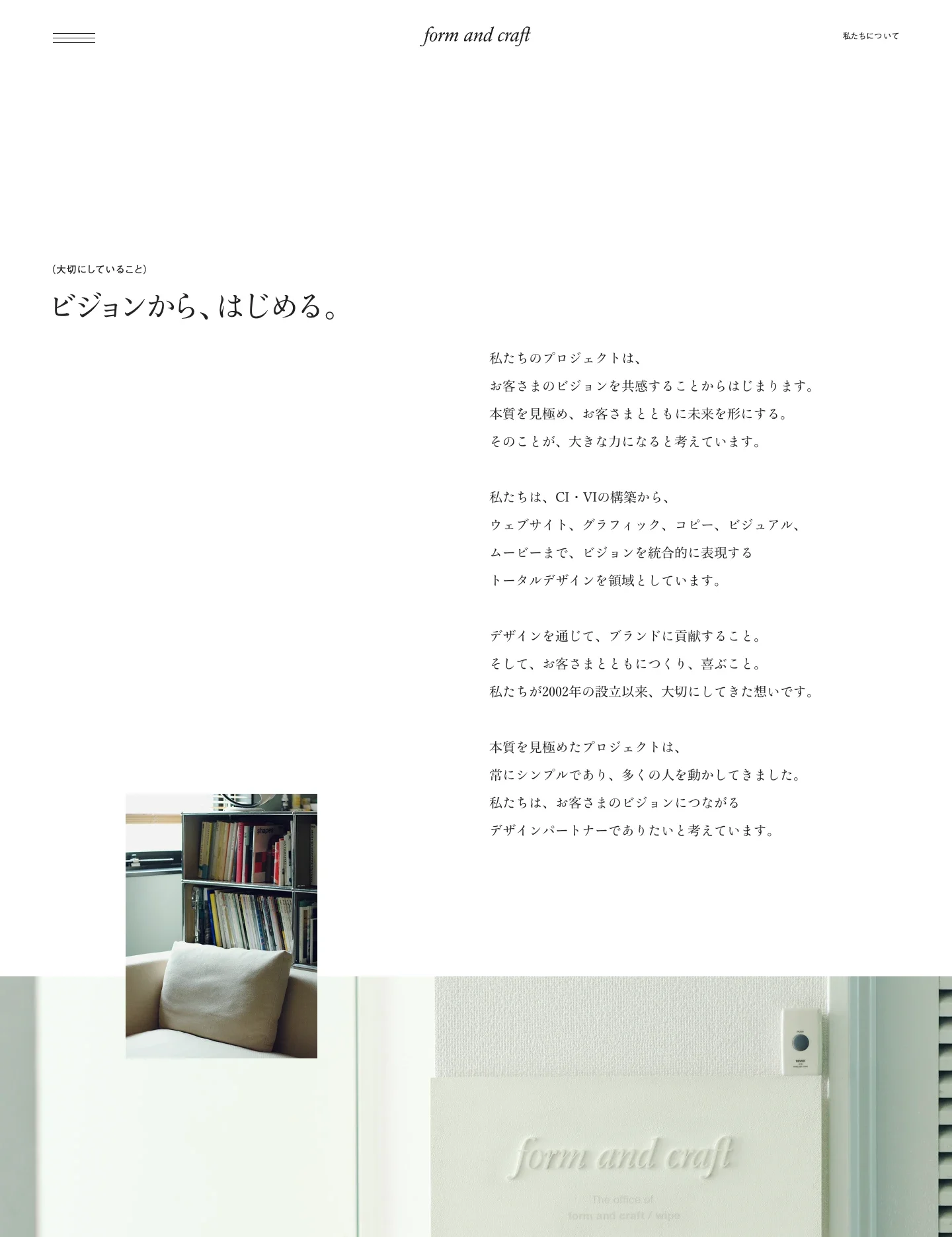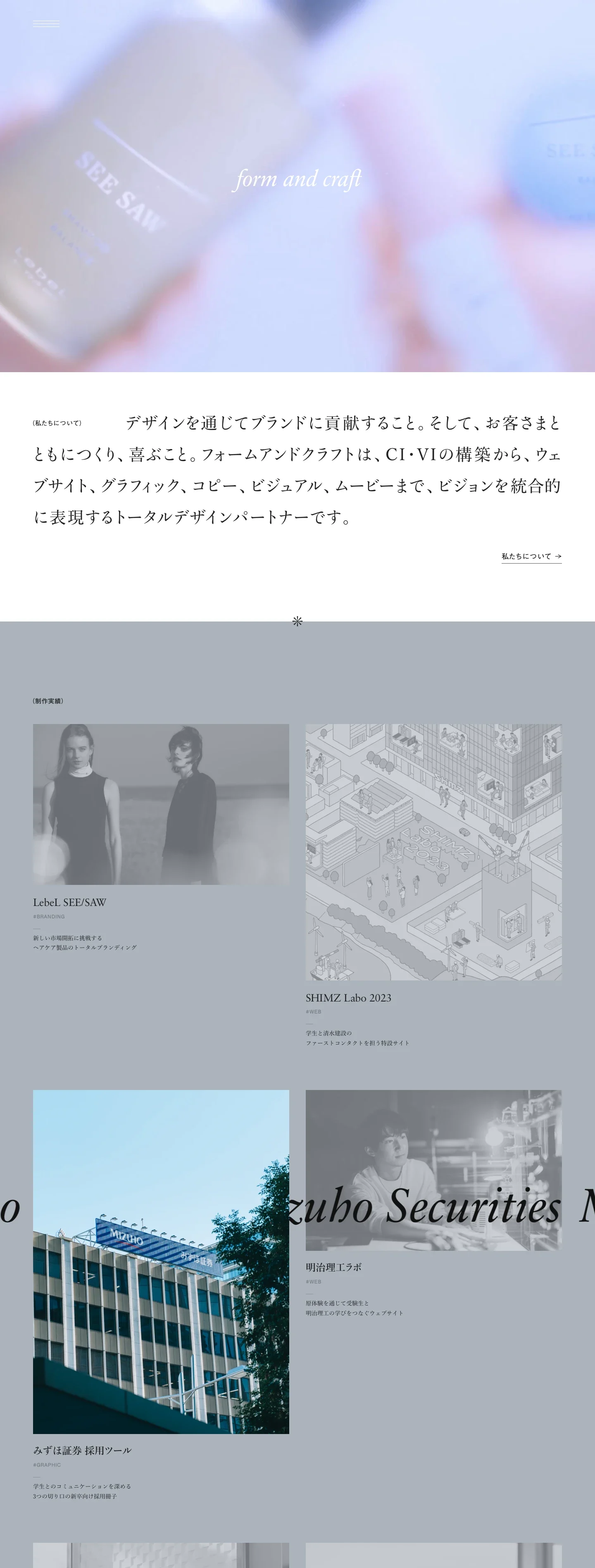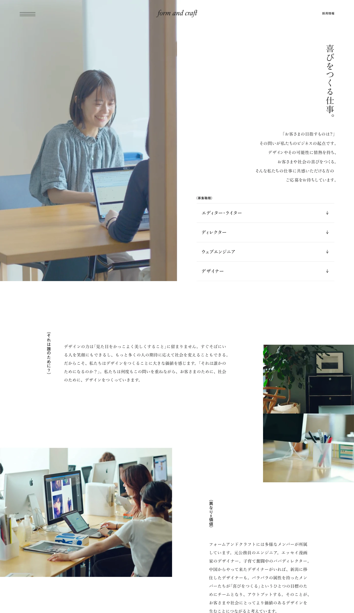 私の在籍するデザイン会社「フォームアンドクラフト」約10年ぶりのコーポレートサイトリニューアル。以前のサイトでは伝えられていなかった同社の事業領域やクライアントとの関係性,仕事への考え方などを丁寧に伝えることを目的に,サイト構造や言葉,ビジュアルを設計していった。