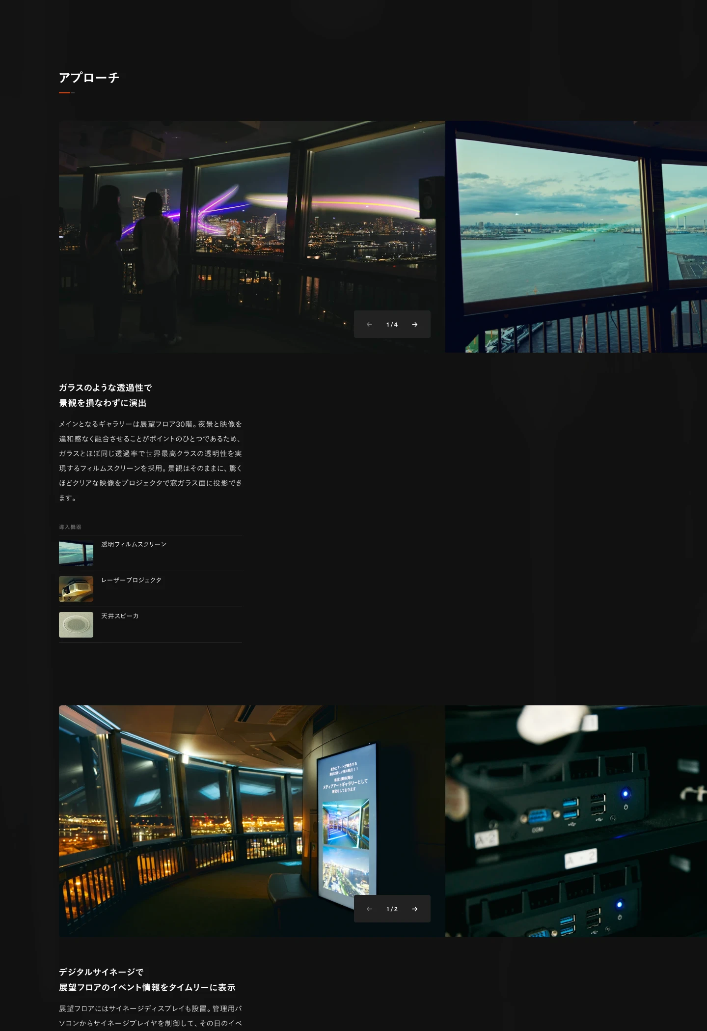 モデルを起用するメインビジュアルは初回提案時にすでにあったアイデアで,それがほぼそのまま実現することになった。“映像システムは人を感動させるコンテンツをつくるのではなく,感動が生まれる場所をつくる”という同社の立ち位置から,人々が映像を見て感動している様子を横から見ているというシチュエーションを考えた。キャスティングは主に他案件ではADをされている松尾さんが担当し,演技のできる俳優の方を中心にアサイン。それを大きくトップのFVに配置することで,同社のイメージを深く印象づけるサイトになったと思う。ちなみにモデルの方々が見ている映像は「インターステラー」。
