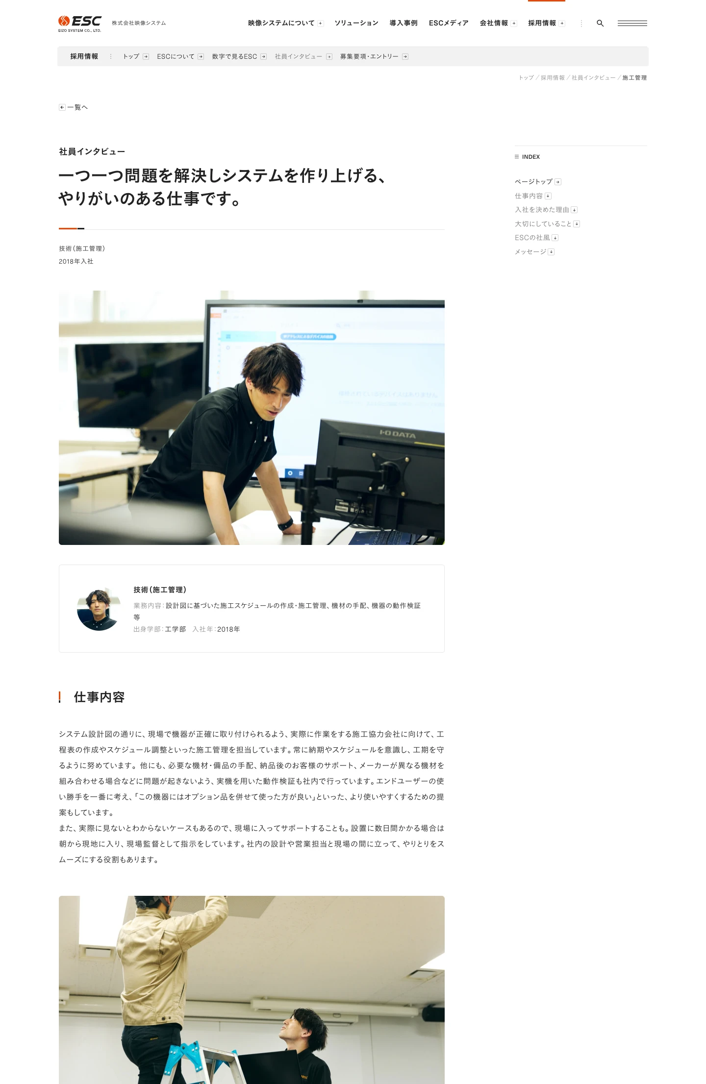 ウェブ上での社員の方々の顔出しNGという制約の中で,(顧客含む)社内外問わない人間関係のあたたかさや仕事に対する真摯な姿勢を伝えるために,コンテンツで働く人の声を,写真で現場の空気感を,文体・デザインで真摯な姿勢を表現した。