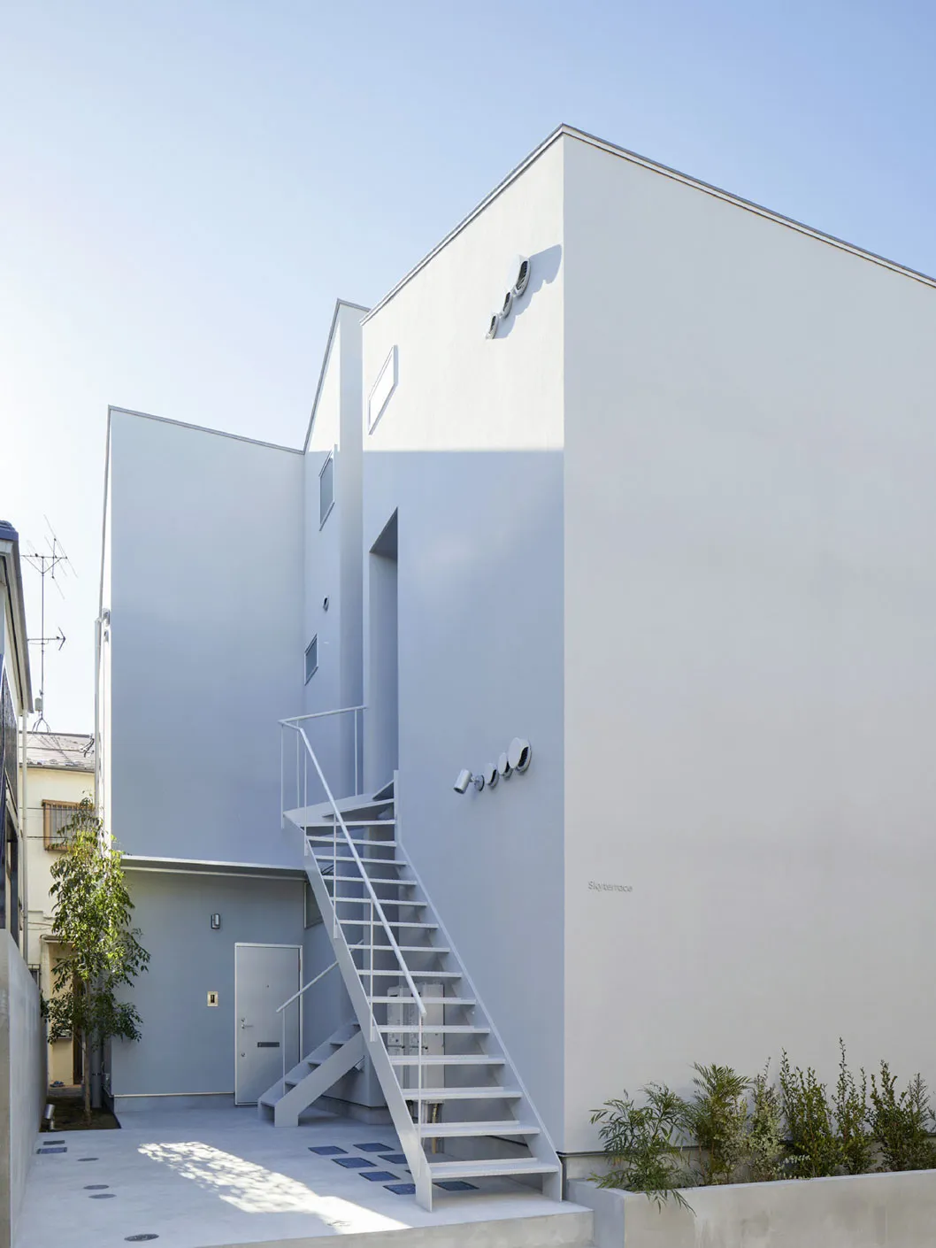 同物件の外観は一面白壁で無機質な印象だが,”空にひらく家”というコンセプトのとおり,全部屋には空に突き抜けた中庭が配されるなど建物の内部は有機的な空間となっている。
